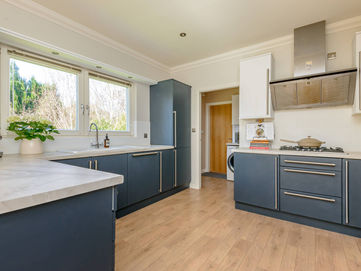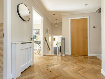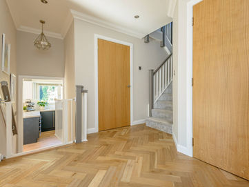 On the split-level ground floor, the welcoming entrance vestibule leads into an internal hallway, with wooden parquet flooring and a two-piece WC with a chrome heated towel rail. The bright, dual-aspect lounge features double patio doors opening to the rear garden, while the heart of the home is the impressive recently modernised kitchen/dining room, complete with integrated appliances and further patio access. A fully fitted utility room provides access to a large pantry, the garden, and integral double garage which has been floored and includes a home gym. Finally, there is a family room, which is currently utilised as a home office.